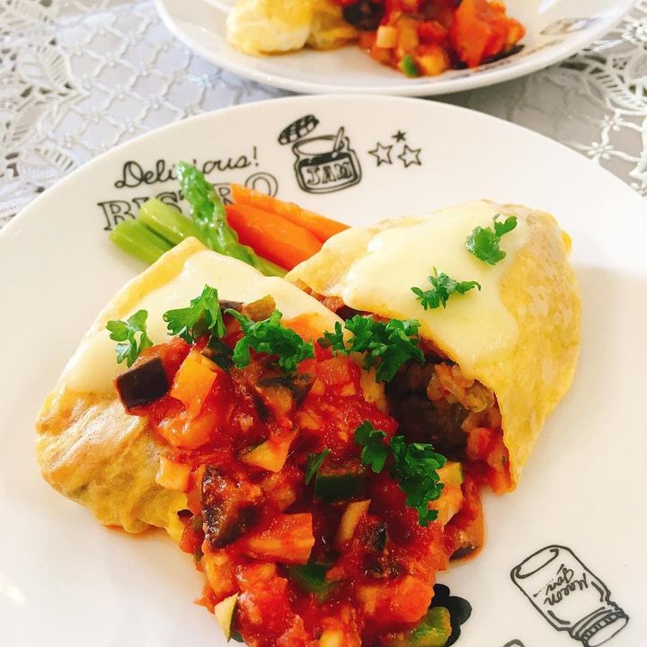 こちらはラタテュイユをソースにしたアレンジ。夏野菜たっぷりなので栄養満点かつボリューミーで嬉しい一品です。