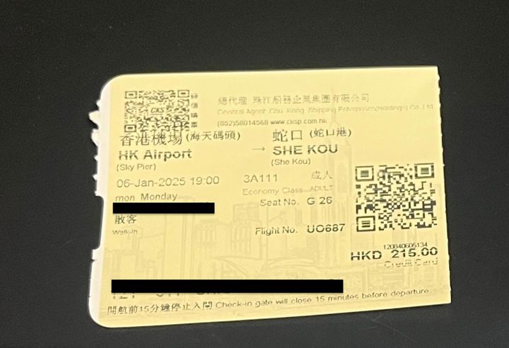 筆者は予約せずに直接カウンターで乗船手続きを行いました。料金は215HKD(当時)で、クレジットカードでも支払可能。特に申し出なければ、最短で乗船できるフェリーのチケットが発券されます。