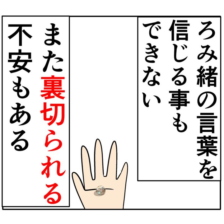 あかりちゃんがくれたお守りの石を見つめながら、「ろみ緒の言葉を信じることもできない。また裏切られる不安もある」と再構築する決心がなかなかつかないめいさん。
