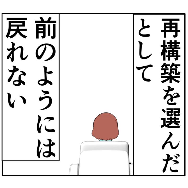 「離婚したくない」とろみ緒さんに言われためいさんは考えます。お父さんのことが大好きで家族でお出かけするのが大好きなあかりちゃんの気持ちを知っているめいさんは、あかりちゃんを悲しませたくないと思いますが、ろみ緒さんと夫婦関係を再構築することを選んでも以前のようには戻れないと感じます。