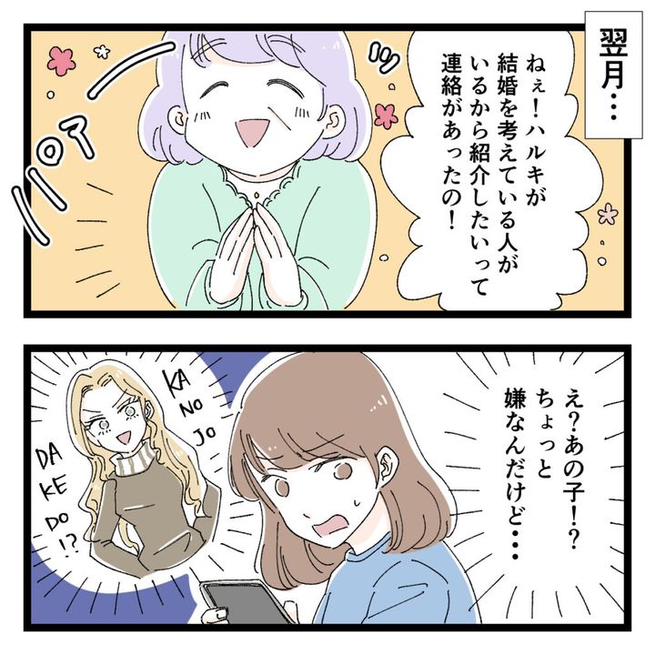 「ねぇ!ハルキが結婚を考えている人がいるから紹介したいって連絡があったの!」お母さんが顔を輝かせてそう言うのを聞いて、「え?あの子!?ちょっと嫌なんだけど・・」ハルキの家でバッタリあったセリナという女の子のことを思い出し、嫌な予感しかありませんでした。