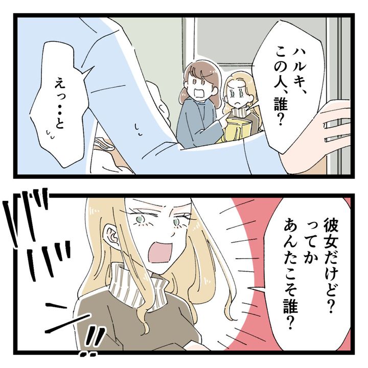 帰って来たばかりのハルキに「この人誰?」と聞くと、「えっと・・」と言葉を濁すハルキを遮って「彼女だけど?ってかあんたこそ誰?」と強気の口調でたずねられて困惑。