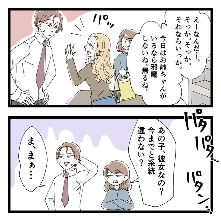 ハルキさんの家に勝手に入って来た女の子に驚くカホさん。もっと驚いたのは部屋の住人ハルキさん。「ハルキ、この人誰?」とカホさんがたずねると、すかさず「彼女だけど?ってかあんたこそ誰?」と突っかかる女性に「セリナちょっと黙って。姉ちゃん今日はどうしたの?」とハルキさんが言うとセリナさんという女性はビックリ!「お姉ちゃん?そっか。お姉ちゃんがいるなら邪魔しないね」そう言ってとっとと帰って行くセリナさんを見て、「あの子彼女なの?今までと系統違わない?」とカホさんが突っ込むと困ったように言葉を濁すハルキさんが、後日結婚を考えている人がいると言い両家の顔合わせを行うことに。「え?あの子?嫌なんだけど」とカホさんが思いながら当日に。ハルキさんが予約した高級レストランの前で立っていると、一人の女性があらわれました。