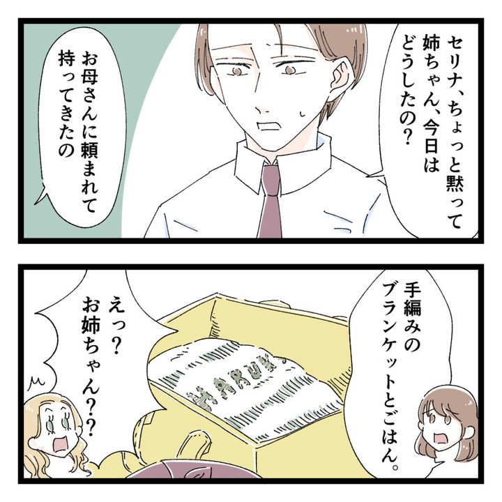 すると、「セリナちょっと黙って。姉ちゃん、今日はどうしたの?」とハルキが言い、「お母さんに頼まれて持ってきたの。手編みのブランケットとごはん」と答えると、「えっ?お姉ちゃん??」とセリナと言う女の子がビックリ!
