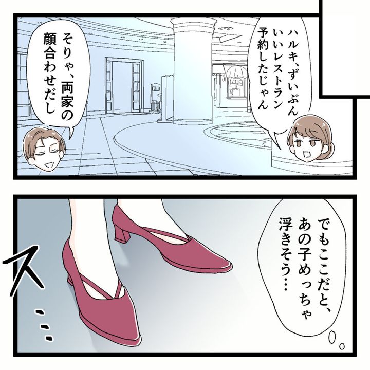 「ハルキ、ずいぶんいいレストラン予約したじゃん」あまりに奮発するハルキにそう言うと、「そりゃ、両家の顔合わせだし」と当然と言った風に答えたものの、「でもここだとあの子めっちゃ浮きそう・・」とセリナという子を思い出しちょっぴり心配する私の前に、女性があらわれました。