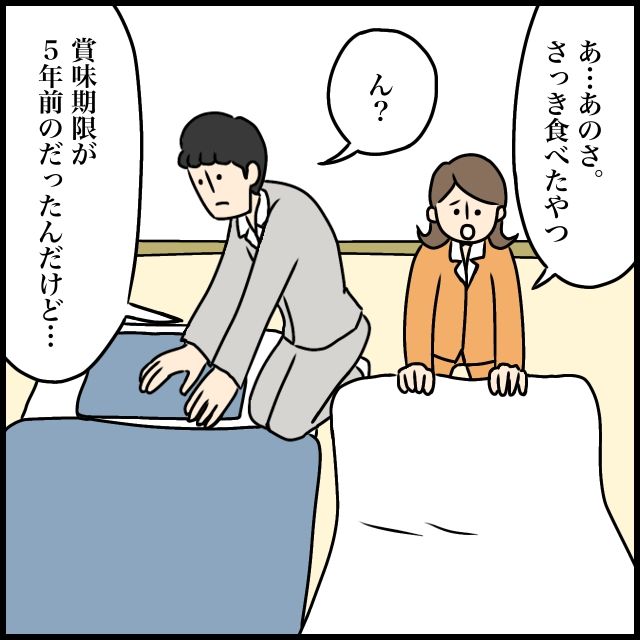 そして夜になり、「あ・・あのさ。さっき食べたやつ」そう切り出した後、「賞味期限が5年前のだったんだけど・・」恐る恐る夫にそう伝えたのでした。