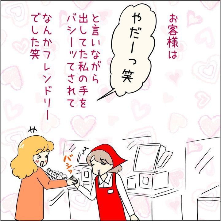 するとそのお客さん、恥ずかしさからか「やだーっ」と言いながら、あとみさんの手を思わずハイタッチのようにパシッ!と叩いたのだとか。