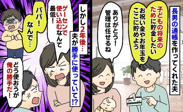 長男が生まれてすぐ、夫が子ども用の通帳を作ってくれました。お祝い金やお年玉などを貯め、将来の学費の足しにしようと決めたのです。しかし、2年が経ったある日、子ども用通帳の貯金額を夫に確認すると「使った」と言われ、夫婦喧嘩が勃発! すると2歳の長男が来て……?