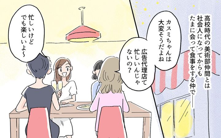 カスミは都内の広告代理店で働いています。高校時代の美術部仲間とたまに集まっては気を遣わず話せる関係だったのですが。カスミが妊娠してから仲間の一人、リサからの微妙な嫌味にモヤモヤするようになって…。