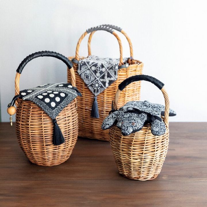 「満員電車でかさばらないこと」がコンセプトの「どんぐりバスケット」は、クマや刺し子のカバーのほかに籐のふたつき。
