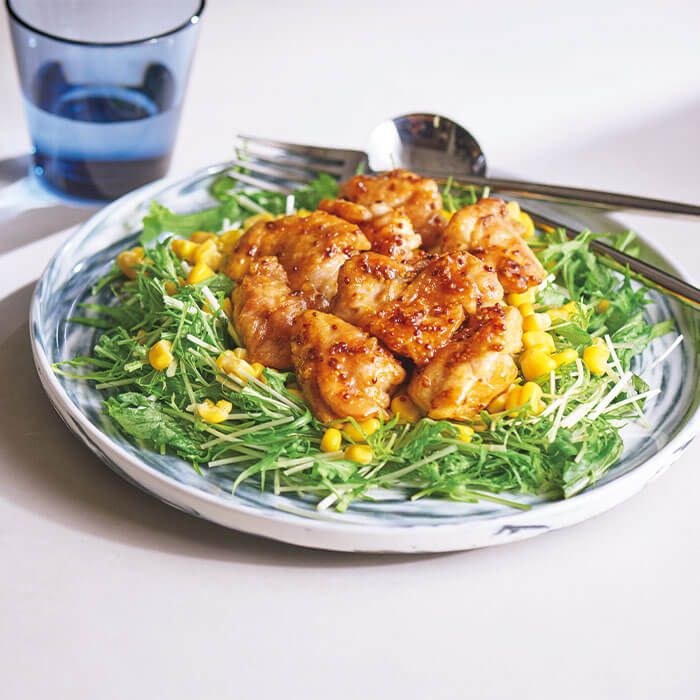 2. フライパンに油をひき、1の鶏肉を加えて中火で両面を焼く。焼き色がついたらひっくりかえし、フタをして、3~4分蒸し焼きにする。余計な油を拭いてから、「ハニーマスタードドレッシング」をかけて味つけをする。