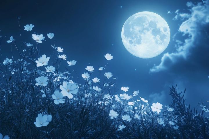 Fantasy illustration of white flowers under a glowing moon in a dreamy night sky landscape