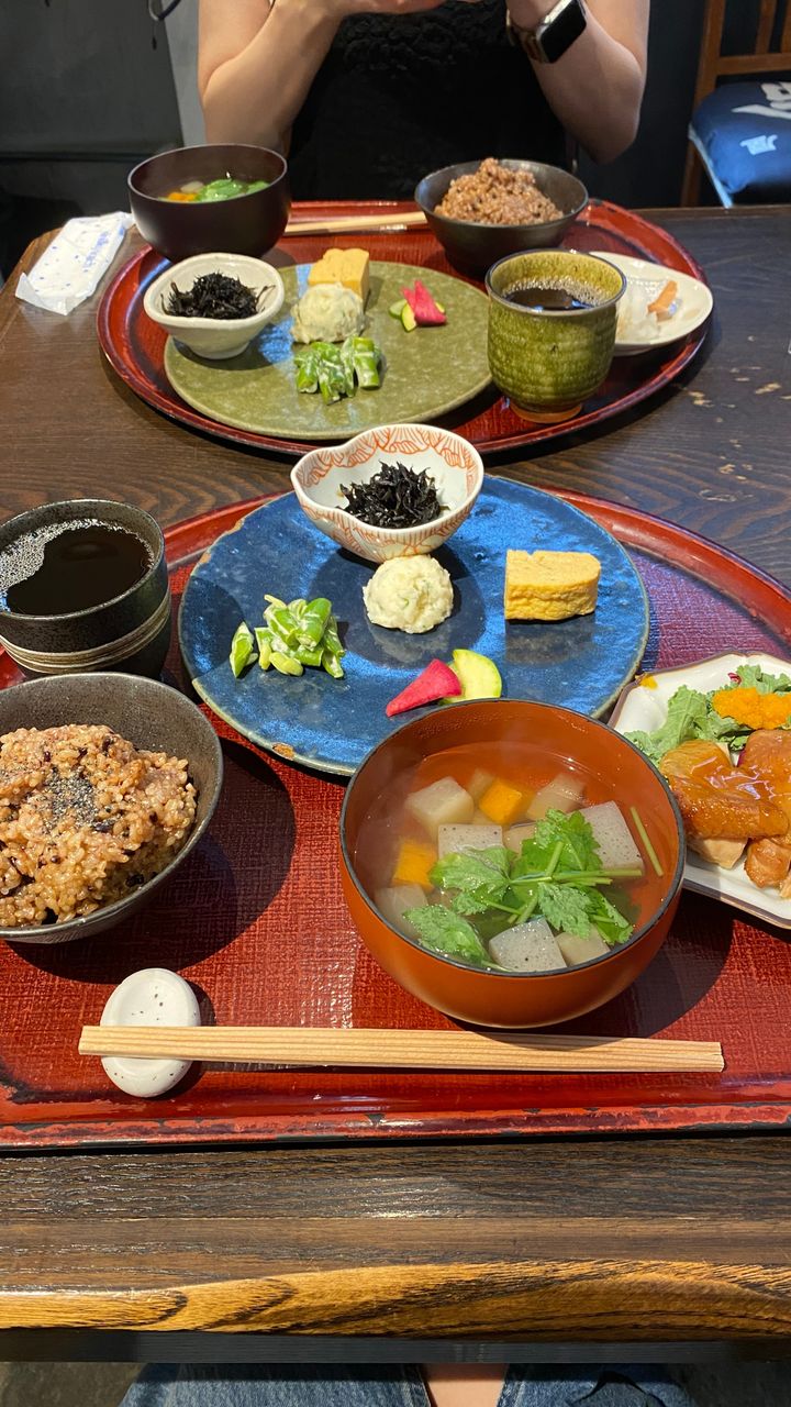 メニューは3種類で、寝かせ玄米+汁物の箱膳定食、主菜が付いたハレ箱膳定食、主菜に刺身がついた