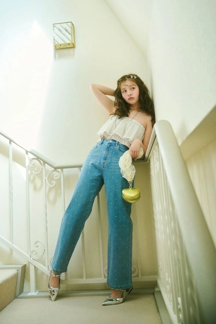 レイヤードトップス 10,550円/ミーンデリ(HANA KOREA)デニムパンツ 5,990円/神戸レタス チョーカーネックレス 1,980円/GOLDY バッグ 10,450円/ダイアナ(ダイアナ 銀座本店)サンダル 7,900円/チャールズ&キース(チャールズ&キース ジャパン)ヘアピン/スタイリスト私物