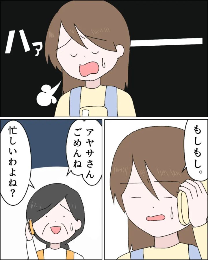大きく一回、ため息をついてから電話に出ました。すると、「アヤサさんごめんね、忙しいわよね?」と遠慮がちな義母の声。