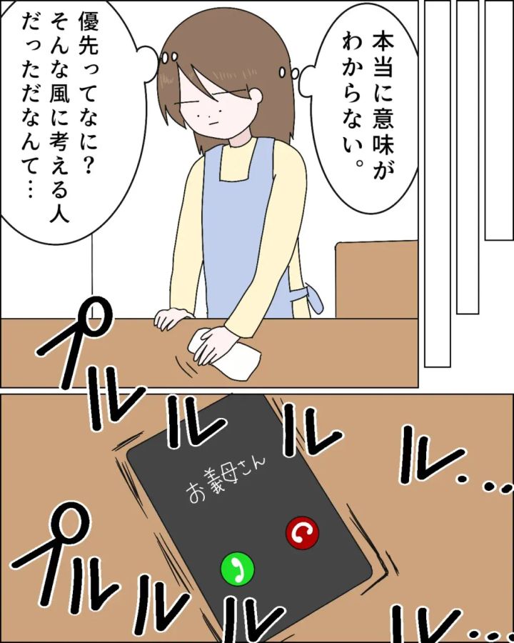 ユキヒロのあまりにも自分勝手な主張に「そんな風に考える人だったなんて」と、本当に意味が分からない私です。ひとり悶々としていると、義母からの着信がありました。