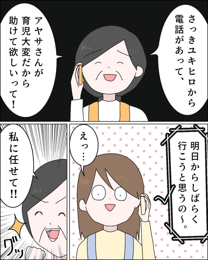 「さっきユキヒロから電話があって、アヤサさんが育児大変だから助けて欲しいって!明日からしばらく行こうと思うの~。」と義母。私は「えっ・・・」と固まってしまいました。「私に任せて!」と息子に頼まれてやる気に満ち溢れた声で義母は言いました。ぜったいに断れそうにない雰囲気です。