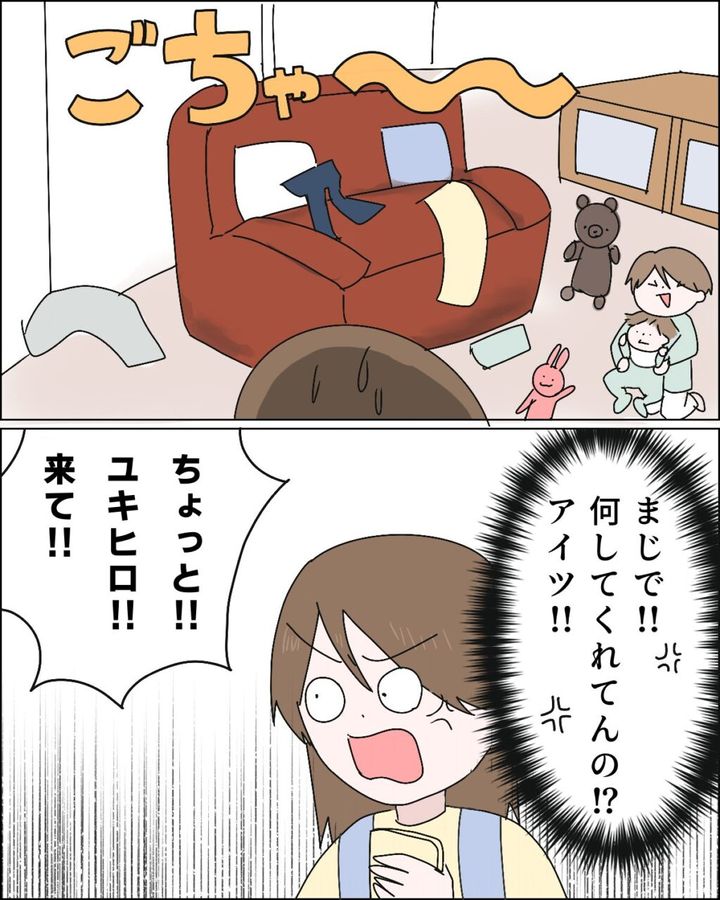 部屋を見回すと、掃除も洗濯も片付けもまだ途中で、さらにチアキがおもちゃを引っ張り出してカオス状態。マジで!!何してくれてんのアイツ!!イラッとしましたがそんなことを言っている場合ではなく、とにかくこの散らかり放題の部屋を何とかしなくては。「ちょっと!!ユキヒロ!!来て!!」私はすぐに大声で夫を呼びました。