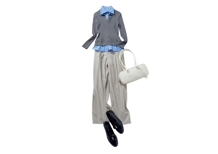 本社で内勤の日は、レイヤードしてる風のニットの力を借りて、GUパンツで簡単コーデ。ドッキングニットはモコつかずさらっと着られるのでスマートな着こなしが叶います。ブルーをポイントで効かせて爽やかな印象に。