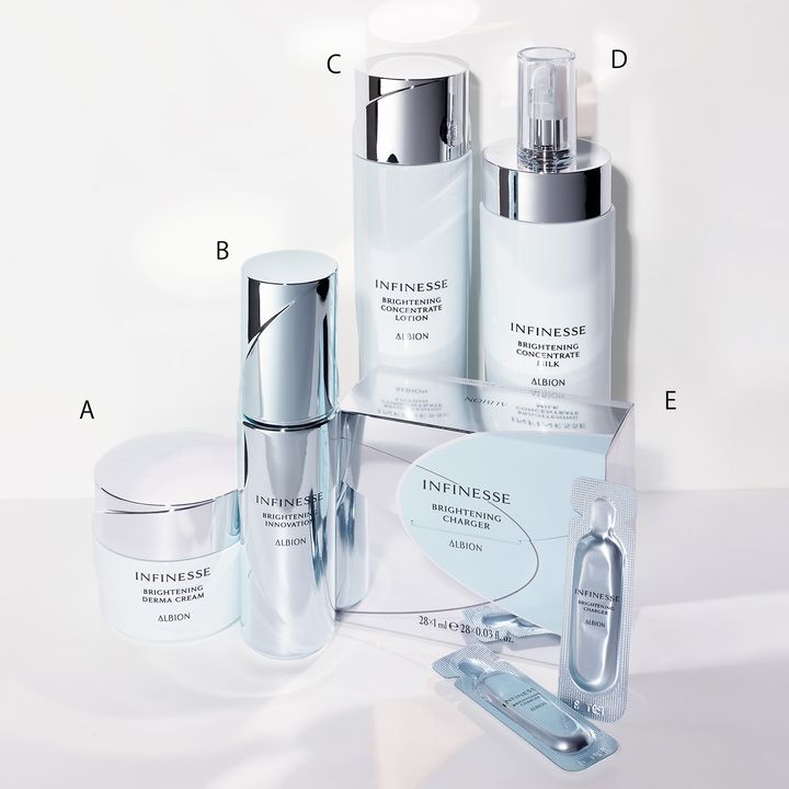 複雑なコラーゲン世界の研究を続けてきたアンフィネスが、最先端テクノロジーとサイエンスを凝縮し「美白」と「ハリ」の両立に成功。美白有効成分ナイアシンアミドを配合した乳液(D)、化粧水(C)、美容液(B)、クリーム(A)と、1回1本使用する集中美白美容液(E)。ライン使いで360°ゆるぎない白さとハリに満ちあふれた肌に。Dから)200g¥7,700、200ml¥7,700、40ml¥11,000、30g¥13,200、1.0ml×28個¥8,800[すべて医薬部外品]※すべて3/18発売(すべてアルビオン)