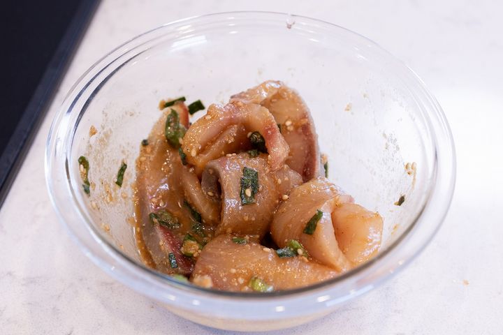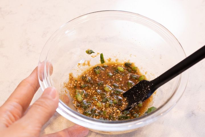 3. 2B・白すりごま・青ねぎ・ぶりの刺身を加えて、全体をやさしく和える。
