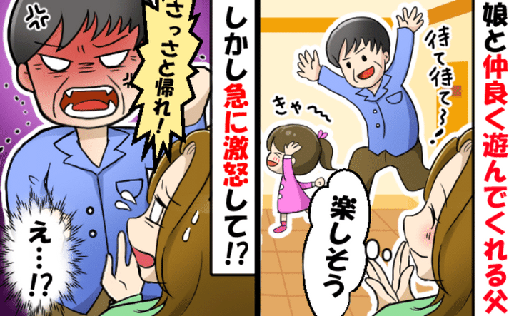 私は保育園のお迎えが終わると、娘を連れて毎日のように実家へ。この日も実家に立ち寄り、娘は私の父と室内で追いかけっこを楽しんでいます。途中、逃げる娘がリビングの扉を「バタン!」と勢いよく閉めると、なんとそれまでニコニコ顔で娘と遊んでいた父が「おい! 壊れるだろ!」とすごい剣幕で怒りをあらわに……。驚いた娘は泣き出してしまいました。