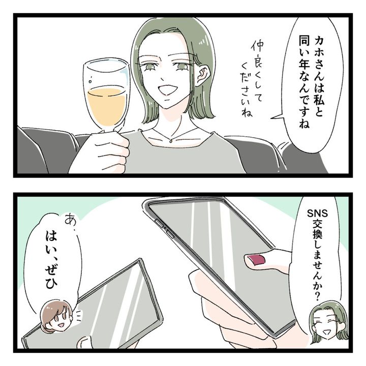 「カホさんは私と同い年なんですね。仲良くしてくださいね」そう言ってグラスを手向けた後、「SNS交換しませんか?」そう言われ「あ、はい、ぜひ」と答えながら、