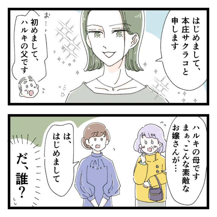 「はじめまして。本庄サクラコと申します」そう挨拶した女性は、あの時のセリナという子じゃない!「あっ初めまして。ハルキの父です」「ハルキの母です。まぁ、こんな素敵なお嬢さんが・・」お父さんとお母さんが挨拶した後、「は、はじめまして・・」と挨拶したものの、「だ、誰?」と心の中で思っていた私。