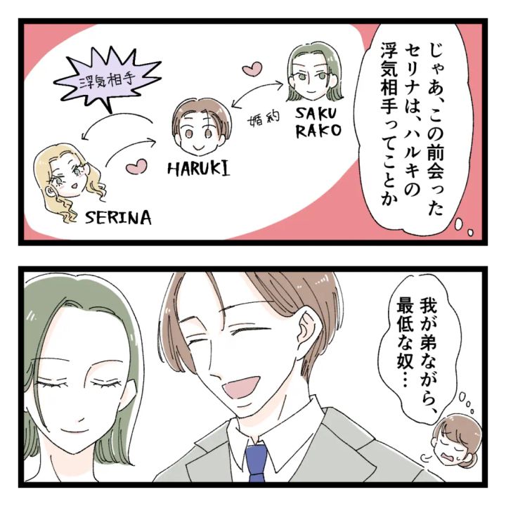 私はようやくわかりました。ハルキがセリナの存在を濁していた理由。「じゃあ、この前会ったセリナはハルキの浮気相手ってことか・・我が弟ながら最低な奴・・」と呆れていると、