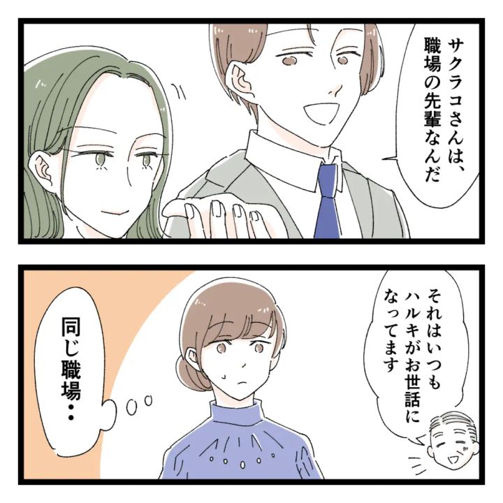 結婚を考えている人がいる、とハルキさんが言い、「あの子は嫌なんだけど・・」とセリナさんのことを良く思っていなかったカホさん。両家顔合わせの当日、高級レストランを予約したハルキさんの前にあらわれたのは、セリナさんではなく本庄サクラコと言う美しい女性。同じ職場の先輩と紹介されたサクラコさんはカホさんと同じ年。「キレイな人だけど、ハルキにはもったいない気がする・・」と思いながらハルキさんをじっと見ていると、視線に気づいたハルキさんがフイッと他所を向き、カホさんは何とも言えない気持ちになりました。