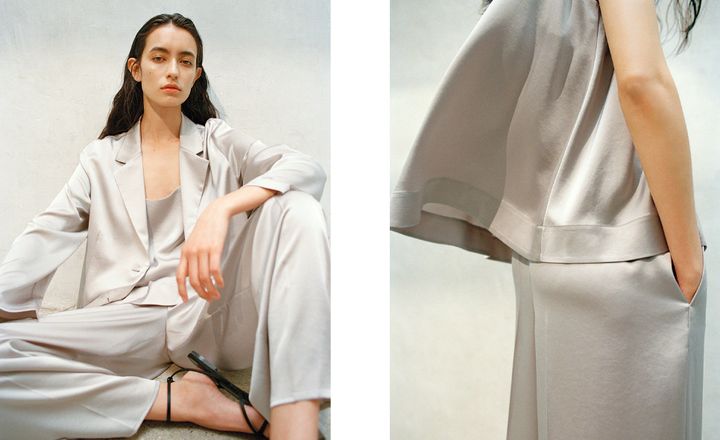 「トリアセテート サテン」は、上質なトリアセテートを混紡したサテン生地を使用したシリーズ。フォーマルなアイテムに使われることが多いサテン生地を、リラックス感のあるシルエットに落とし込み、大人の余裕を感じさせる佇まいに。体のラインを拾いすぎない自然なドレープが、エレガントさを演出する。