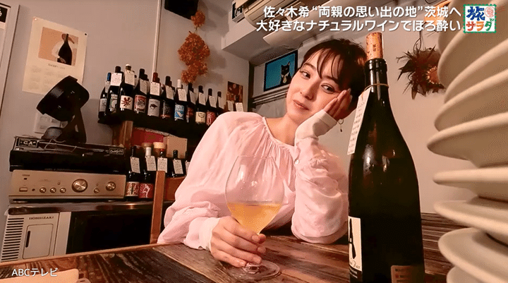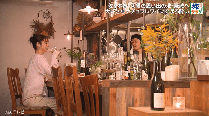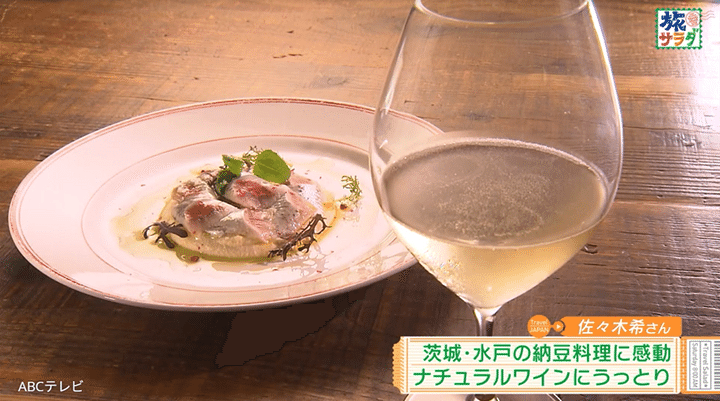 佐々木希の旅は、両親のゆかりの地である茨城県の水戸市からスタート。ナチュラルワインが大好きな佐々木は、水戸駅近くの商店街にある、ナチュラルワインと創作フレンチの店・Loupiote(ルピオット)へ。500本以上のワインの中から、フランス産のスパークリングワインを1杯目に選び、「あ~おいし~最高ですね~!」と、うっとり味わった。