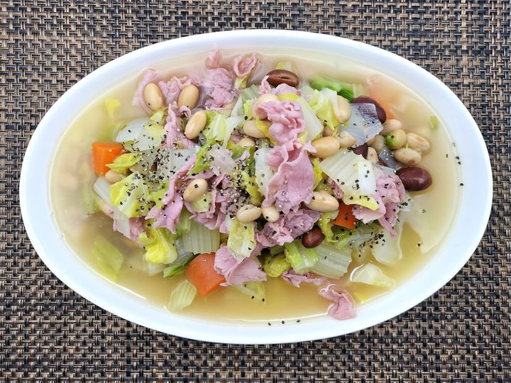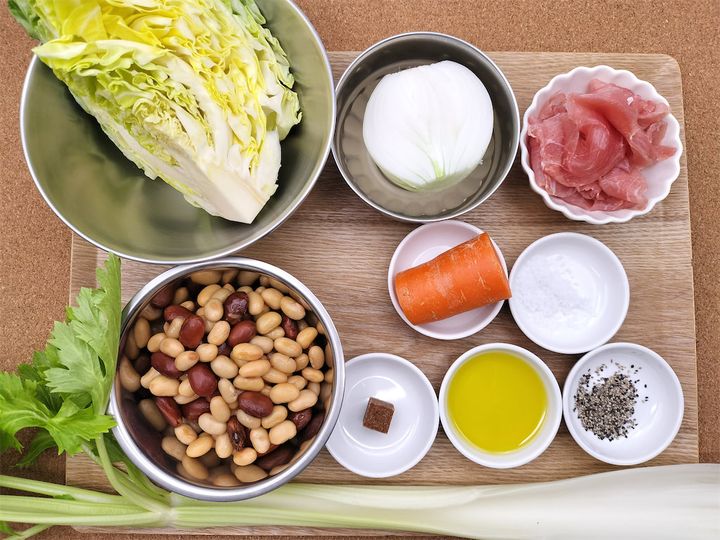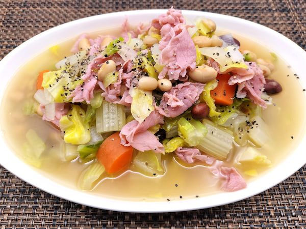 春野菜のスープとのことでしたので、もっと大量に野菜を入れるのかと思ったら案外と豆が多めな印象でした。それほど煮込んでいる感じではないのに食べてみると、野菜はどれも柔らかく、春野菜の甘味とそれぞれの持つ味がしっかりと感じられるスープです。多少の塩は使っていますが、味の要はやはり生ハムです。野菜と一緒に口へ運ぶと、やさしい塩味と生ハム特有の風味がとてもおいしく思えました。生ハムはメーカーによって塩分や味が違いますので、お好みの生ハムで試してみてください。