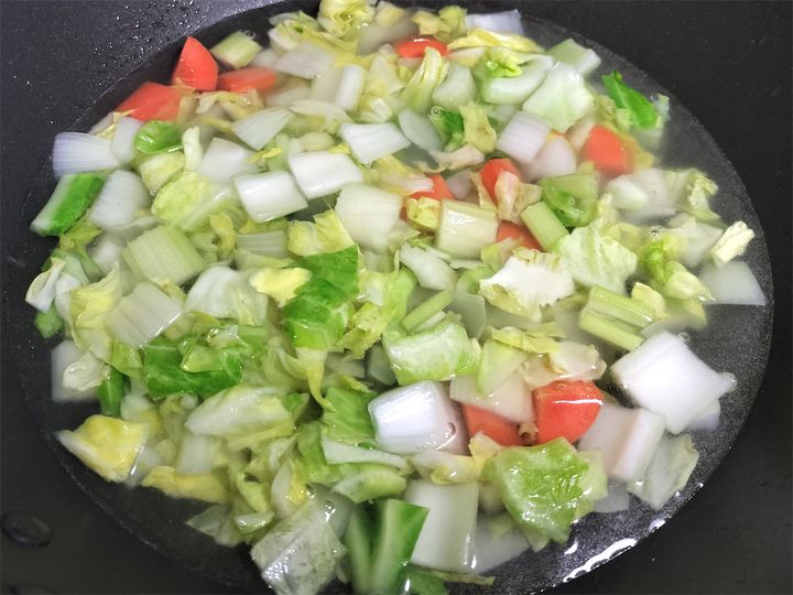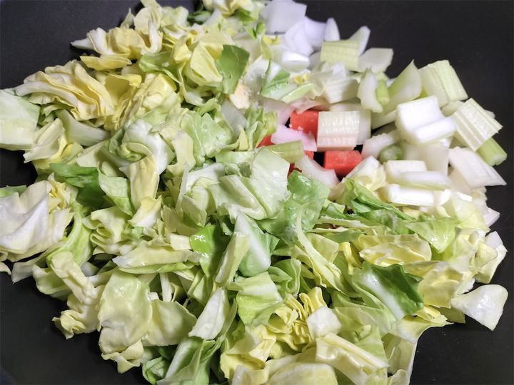 1.  鍋にオリーブオイルを引いて弱火で熱し、野菜(春キャベツ、新玉ねぎ、春にんじん、セロリ)と塩ひとつまみを入れてじっくりと炒めます。