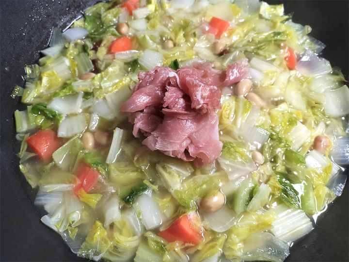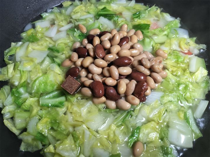 3.  ミックスビーンズ、固形スープの素を加えて約10分間煮ます。