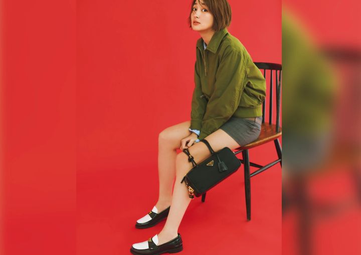 靴¥176,000、ブルゾン¥506,000、シャツ[参考色]¥170,500、スカート¥280,500、バッグ¥390,500(すべて予定価格)/以上プラダ(プラダ クライアントサービス)