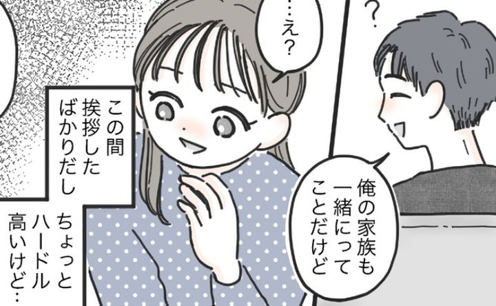 そんな結婚あいさつから数日後……。彼から「家族でテーマパークに行こうよ!」と誘われました。もちろん!と返答したものの、「ん?」と彼の「家族」という言葉が引っ掛かって……。入籍して家族になったら行くという意味かな?とも思ったのですが、聞くと、「彼の家族と一緒に」ということでした!