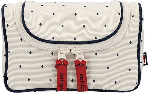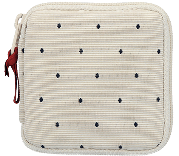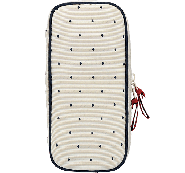 フランス、デュテル社の素材を使用したプチ・デコ。凹凸のあるジャカードは、アイボリーにネイビーのドットが上品なデザイン。赤い引き手がさり気ないアクセントに。