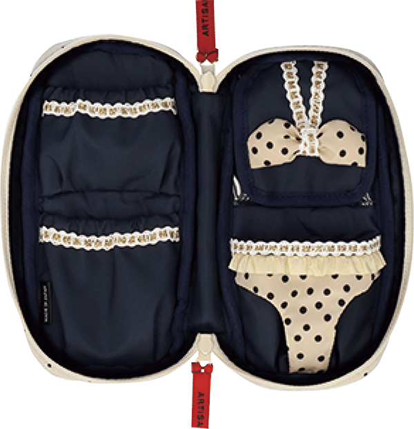 開けた瞬間、水着のデザインに心ときめく新作モデル。ビキニトップの裏面はPVC付のブラシホルダーに、ショーツ部分は小物も挟めるキャッチーな作り。