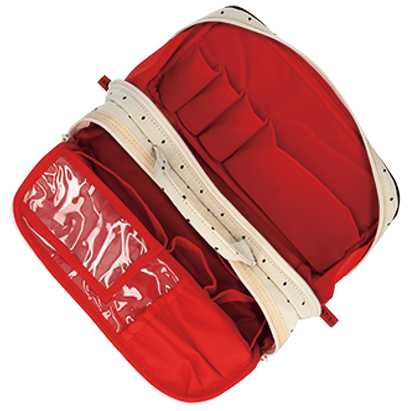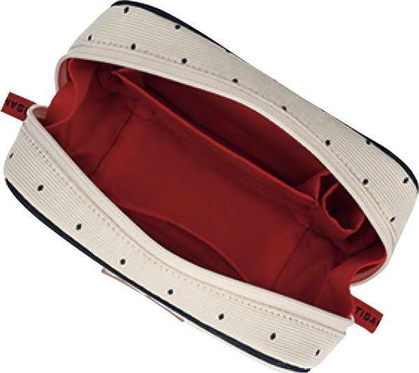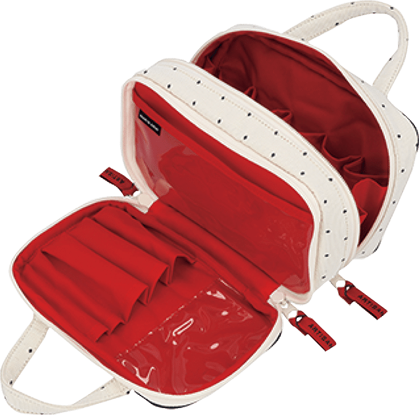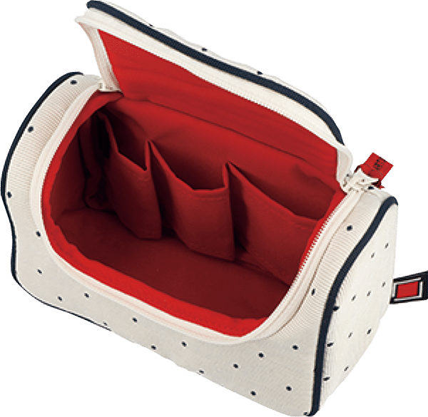 2つに仕切られた大きめポーチは収納力が魅力。手前部分はPVCが施されブラシ類を清潔に収納。しっかりとマチのある奥側には細かなものを入れて。