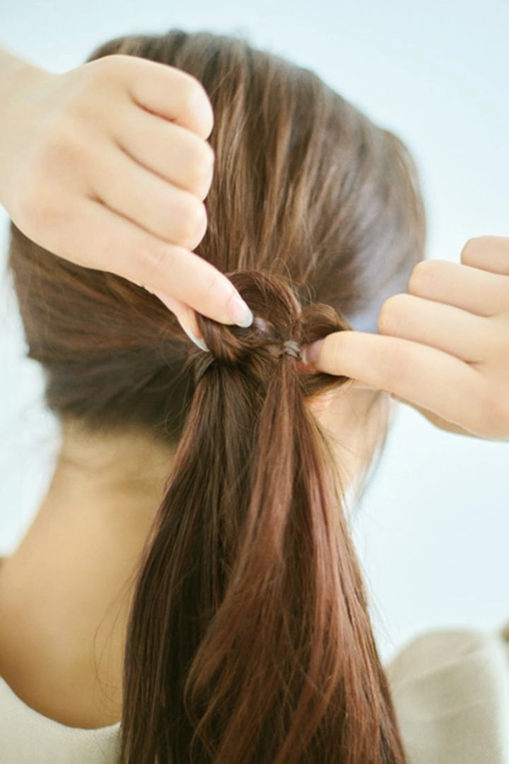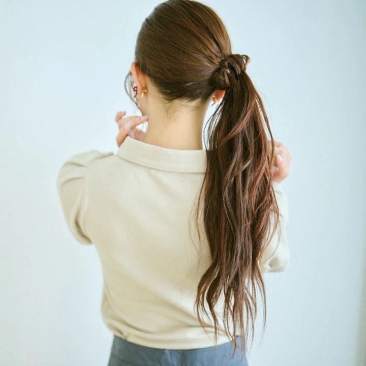 How to 1の結んだ毛束の上から少量の髪をとり、根元から2㎝のところで細ゴムで結んでくるりんぱ。
