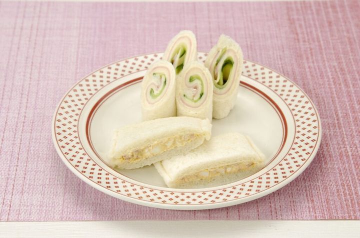 調理するサンドイッチは「たまごツナマヨサンド」と「ハムチーズサンド」の2つ。たまごツナマヨサンドはパンの四辺を箸などで押さえて留め、食べているときに中の具がこぼれない工夫に。クルクルと巻いたロール型が食べやすいハムチーズサンドは、子どもも大喜びしそうなキャンディ風のラッピングがキュートだ。