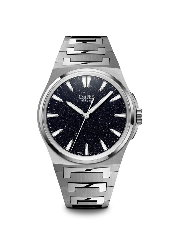ブレスレットとケースを統合した、スポーティなコレクションの新装モデル。ダイヤルをアヴェンチュリンガラスで設え、満天の星を表現した。その上で立体的にファセットカットされた植字インデックスが輝き、装いはかなりドレッシィである。