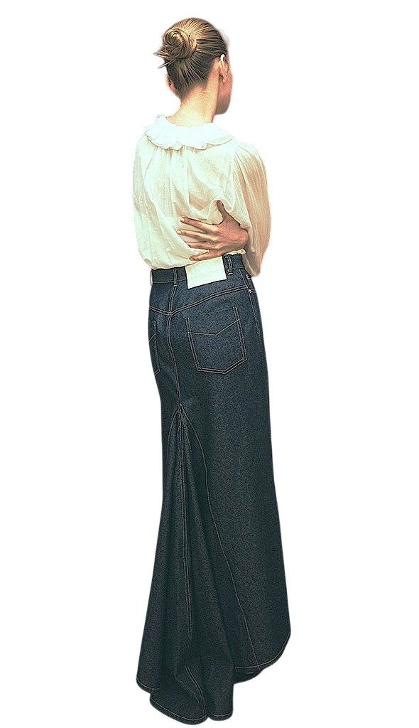 体のラインに沿わせつつ、ひざ下には広がりを持たせた密着感のあるマーメイドシルエット。背面に魚の尾びれのように流れる優美な立体フリルが、後ろ姿でも惹くエレガントなたたずまいに。細身シルエットでも腰まわりの凹凸を拾わないハリのあるデニム生地のおかげで、隠してる感なくすらりとした脚線を演出。 フィッシュテールデニムスカート/リンダ ホップ(office. koizumi.) ブラウス/ビリティス・ディセッタン(ビリティス)