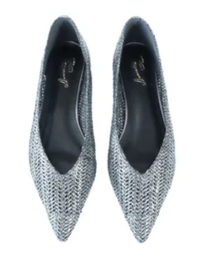 メタリックプリントニット編みフラットシューズ/ダニエラアンドジェマ シルバーで箔をかけた1足。先細フォルムと甲のVカットでさらに引き締まった表情に。