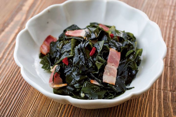 わかめは流水の下でもみ洗いし、たっぷりの水に5分つける。水けをかるく絞り、食べやすい長さに切る。ベーコンは幅1.5cmに切る。フライパンにオリーブオイル大さじ1/2を中火で熱し、ベーコンを入れて1分ほど炒める。わかめ、にんにくを加え、塩、こしょう各少々をふる。唐辛子を手で細かく割りながら加え、1~2分炒め合わせる。