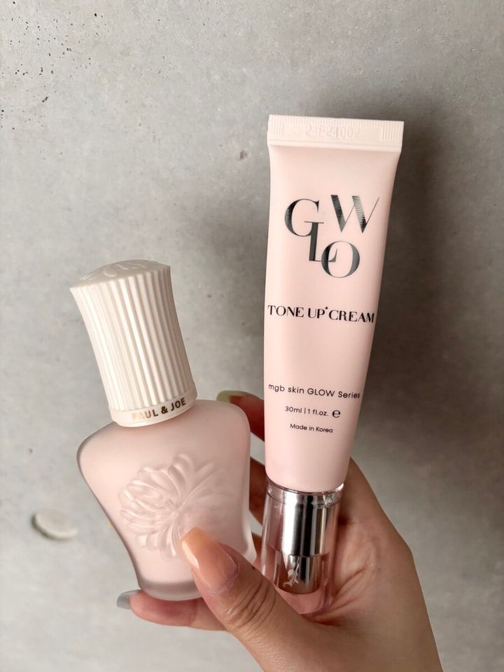 左から:ポール & ジョー プ六テクティングプライマー 00、mgb skin GLOW TONE UP CREAM(共に私物)
