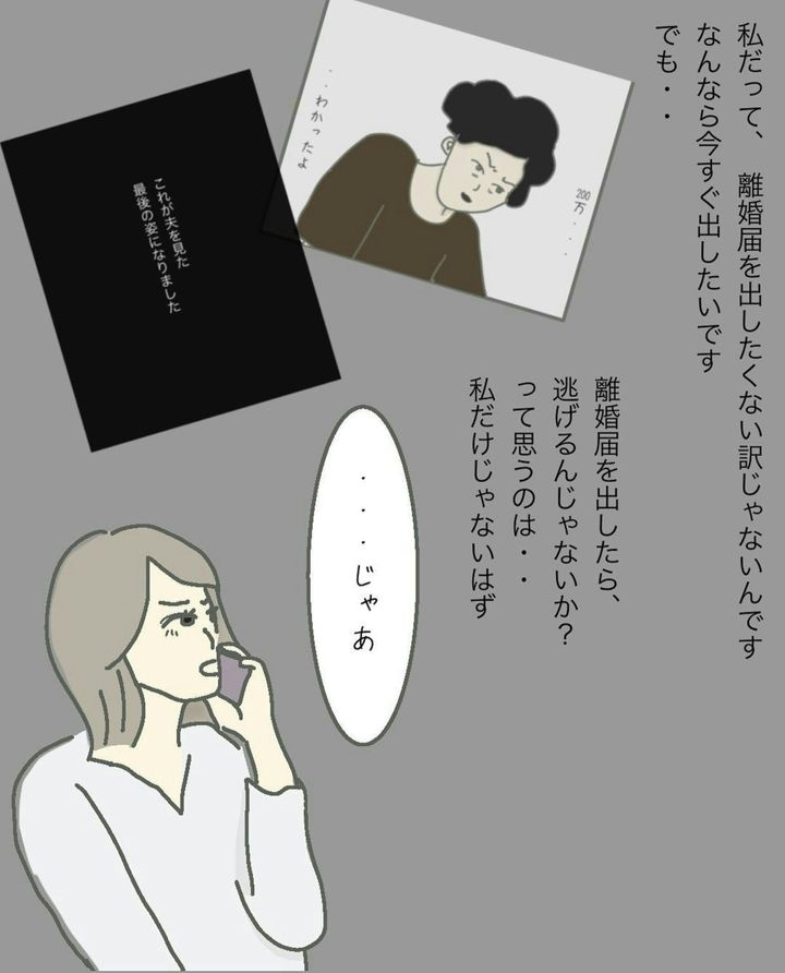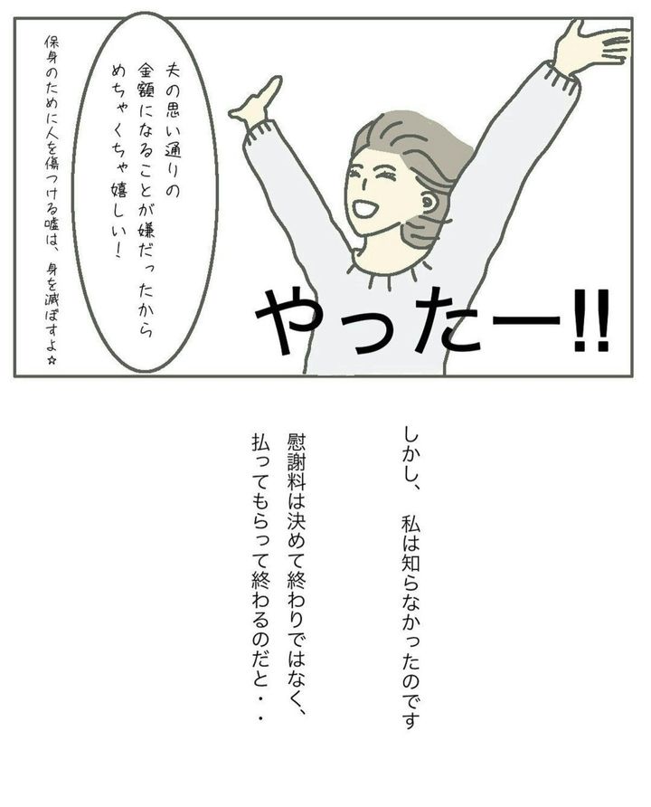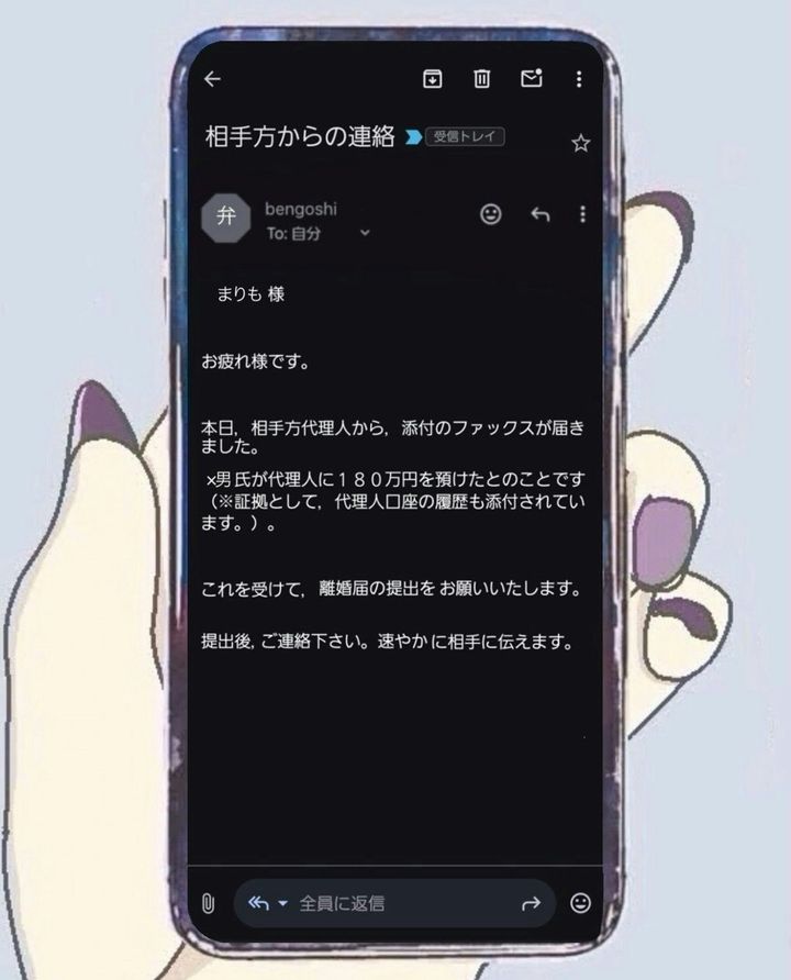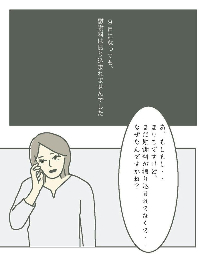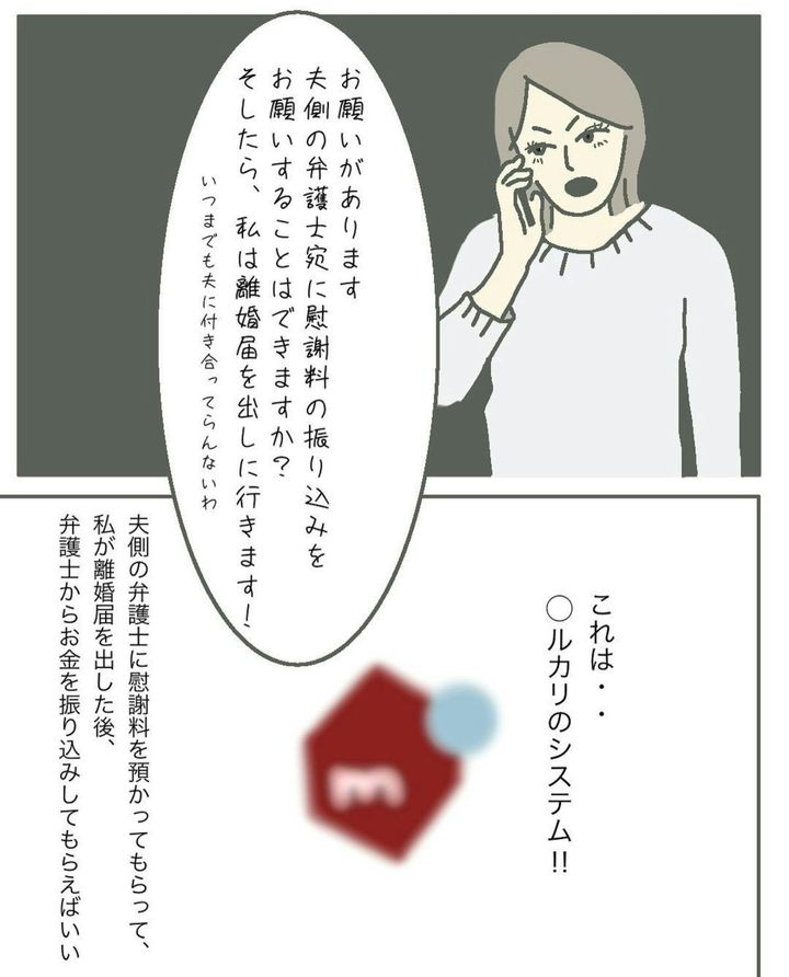 離婚届を出す直前、ようやく慰謝料の保証をしてもらうことができました!夫側の弁護士に、慰謝料の振り込みのお願いについて提案したまりもさん。ようやく、離婚届を提出でき、慰謝料を受け取ることができました。