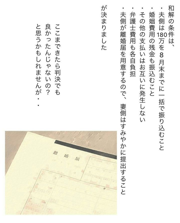 ようやく、離婚に向けて、まりもさんの納得のいく決着がつきそうです。裁判で判決までは行かず、和解することもあるのですね。