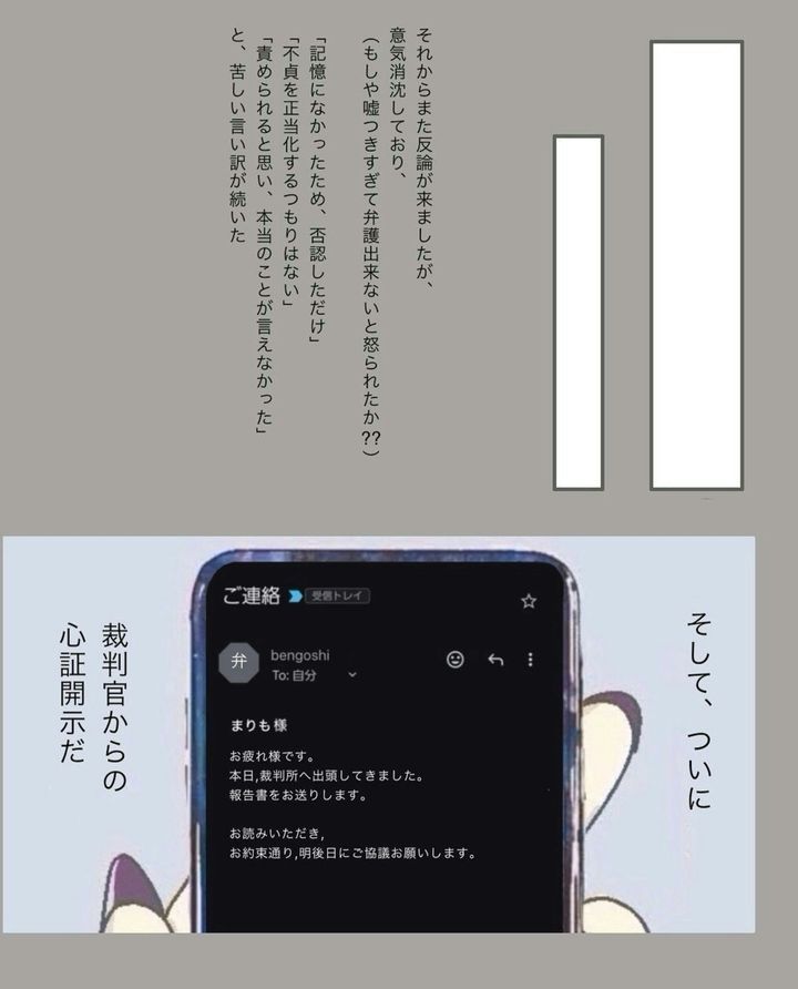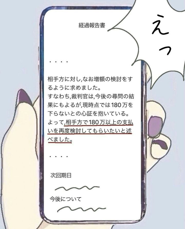 ですが、まりもさんと弁護士側は冷静に反論し、夫の言い分を次々と論破します。最後には、夫側は何も反論できなくなったようです。そしてついに、裁判官の「心証開示」というものが届きます。これは、判決の前に裁判官がどう思っているのかを聞くことができるものです。果たして、裁判官の印象とは?